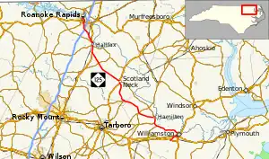 The southern terminus of the route is Martin County SR 1142 (Prison Camp Road) in front of the Senator Bob Martin Eastern Agricultural Center.[3] About 12 mile (0.80 km) north of its interchange with US 13 and US 64, the highway proceeds into the Williamston city limits. After leaving Williamston, NC 125 continues north to serve the small communities of Hamilton, Oak City, Scotland Neck, and Halifax. The highway has an interchange with I-95 shortly before entering its destination town of Roanoke Rapids. The route terminates at NC 48 in the downtown area.
