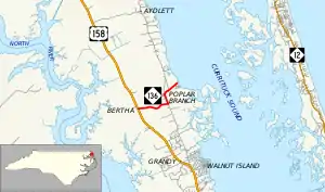 North Carolina Highway 136 (NC 136) is a 2.22-mile (3.57 km) North Carolina state highway that runs entirely within Currituck County. It is a short spur of U.S. Route 158 (US 158), connecting the U.S. Highway to the small unincorporated community of Poplar Branch. The route's eastern terminus is at a boat launch on the Currituck Sound. Prior to 2002, NC 136's current alignment was known as NC 3. In 2002, the numbering of this road and of what was then NC 136 which was located in Iredell and Cabarrus counties swapped to place NC 3 near the home of Dale Earnhardt, a deceased NASCAR driver from Kannapolis who drove the #3 car.