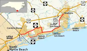 North Carolina Highway 179 Business (NC 179 Bus) was established in 2001 as an upgrade of secondary roads: Beach Drive, Shoreline Drive, and Sunset Beach Boulevard.[3][4]