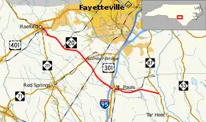 North Carolina Highway 20 (NC 20) is a 27-mile (43 km) North Carolina state highway that runs through Hoke, Robeson and Bladen counties. It serves as a major road in each of the three incorporated communities through which it passes. The route is co-designated as St. Pauls Road in Raeford, Main Street in Lumber Bridge, and Broad Street in St. Pauls.