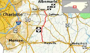 Established in 1935, it is the second incarnation NC 205, creating a new primary routing between the towns of Marshville and Red Cross. In the late 1940s, it was extended southwest along Main Street to the new alignment of US 74; it then changed by 1953 onto a new extension of Elm Street to US 74, leaving Main Street.[2]