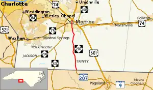 North Carolina Highway 207 (NC 207) is a primary state highway in the U.S. state of North Carolina. It is entirely in the boundaries of Union County and serves to connect the city of Monroe to the city of Pageland, South Carolina, at the South Carolina state line via SC 207.