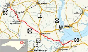 North Carolina Highway 308 Truck (NC 308 Truck) is a 2.5-mile (4.0 km) route that bypasses southeast of downtown Windsor. It overlaps at first with US 13 and US 17, then with US 17 Business.