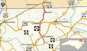 Starting from its southern terminus at NC 305/NC 561 near Tri-County Airport in Mintons Store of western Hertford County, the route immediately enters Northampton County as it progresses northward. In the town of Woodland, NC 35 joins US 258 as Woodland's main street, before turning north again only a couple city blocks later. The road continues north through the towns of Conway and Severn before it turns into Virginia State Route 35 at the Virginia state line. Much of the route runs mostly parallel to the North Carolina and Virginia Railroad and crosses it several times.
