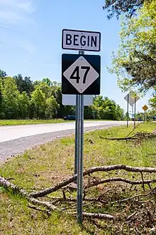The current NC 47 was established in 1972 as a new primary routing between NC 8 to NC 109, in Denton; this was an upgrade of a combination of several secondary roads.[2] In 1974, NC 47 was extended east, as a new primary routing, to its current eastern terminus with NC 49. In 1981, NC 47 was extended west on new primary routing, through Linwood, to I-85/US 29/US 52/US 70 (exit 86).[3] In 1993, NC 47 was rerouted north from Linwood to I-85 (exit 88); its former alignment becoming Belmont Road (SR 3159).[4] In 2013, NC 47 was extended north to its current western terminus with I-85 Business/US 29/US 52/US 70 (exit 84).[5] In December 2018, NC 47 was adjusted at its western terminus from the northbound I-285 exit/entrance ramps to a continuation along Hargave Lane (at Aviation Way) to the overpass bridge at I-285.[6]
