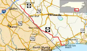 NC 904 is a 67.5-mile (108.6 km) east–west highway (physically running northwest–southeast) that travels from NC 130 in Five Forks, to East First Street in Ocean Isle Beach. It passes through Brunswick, Columbus, and Robeson Counties.[1]