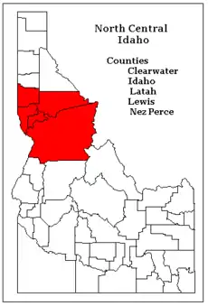 North Central Idaho is an area which spans the central part of the state of Idaho and borders Oregon, Montana, and Washington. It is the southern half of the state's Panhandle region and is rich in agriculture and natural resources. Lewis and Clark traveled through this area on their journey to the Pacific Ocean in September 1805, crossing Lolo Pass and continuing westward in canoes on the Clearwater River. They returned the following spring on their way eastward.