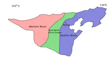 The North China Craton consists of two blocks, the Western Block and the Eastern Block, separated by the 100–300 km wide Trans North China Orogen,[2] which is also called Central Orogenic Belt[1] or Jinyu Belt.[8] The Eastern Block covers areas including southern Anshan-Benxi, eastern Hebei, southern Jilin, northern Liaoning, Miyun-Chengdu and western Shandong. Tectonic activities, such as earthquakes, increased since craton root destruction started in the Phanerozoic. The Eastern Block is defined by high heat flow, thin lithosphere and a lot of earthquakes.[1] It experienced a number of earthquakes with a magnitude of over 8 on the Richter scale, claiming millions of lives.[1] The thin mantle root, which is the lowest part of lithosphere, is the reason for its instability.[1] The thinning of the mantle root caused the craton to destabilize, weakening the seismogenic layer, which then allows earthquakes to happen in the crust.[1] The Eastern Block may once have had a thick mantle root, as shown by xenolith evidence, but this seems to have been thinned during the Mesozoic.[1] The Western Block is located in Helanshan-Qianlishan, Daqing-Ulashan, Guyang-Wuchuan, Sheerteng and Jining.[1] It is stable because of the thick mantle root.[1] Little internal deformation occurred here since Precambrian.[1]