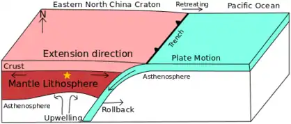 - There are 2 types of lithospheric extension, retreating subduction and collapse of orogens.[4][33][38][41] Both of them have been used to explain lithospheric thinning occurred in the North China Craton.[33][41][4][38]