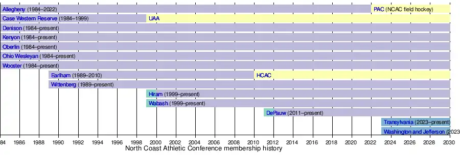- 2022 - Allegheny left the NCAC to rejoin the Presidents' Athletic Conference (PAC) after a 38-year absence, effective in the 2022โ23 academic year.