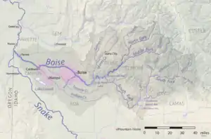 The Boise River is a 102-mile-long (164 km)[2] tributary of the Snake River in the Northwestern United States. It drains a rugged portion of the Sawtooth Range in southwestern Idaho northeast of Boise, as well as part of the western Snake River Plain. The watershed encompasses approximately 4,100 square miles (11,000 km2) of highly diverse habitats, including alpine canyons, forest, rangeland, agricultural lands, and urban areas.