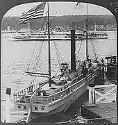 A full-sized, 150 foot long by 16 foot wide steam-powered replica, named Clermont, was built for the 1909 Hudson-Fulton Celebration in New York, by the Staten Island Shipbuilding Company at the Mariners' harbor yards.[11] The replica's design and final appearance was decided by an appointed commission who carefully researched Fulton's steamer from what evidence and word-of-mouth had survived to the early 20th century. Their replica was launched at Mariner's Island, S.I.[11] with great fanfare on July 10, 1909, at Staten Island, New York. Her US Official Number (O.N.) was 206719.[12] The water used to christen her came from the same well Fulton drank from, at Livingston Place, Clermont, New York. Her ship's bell, from the original Clermont, was borrowed from the Hudson River Day Line's riverboat Robert Fulton (1909).[13][14]