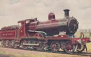 There followed a long period of locomotive construction internally with all locomotives between 1875 and 1900 coming from the company works.[64] The vast majority of these being tank engines although a small number of tender engines were constructed.[64] Most engines, whether tank or tender locomotives were built with either 2-4-0 or 0-6-0 wheel arrangements.[64] An urgent need for heavier goods engines prompted the company to go to contractors and a small number of 0-6-0 designs were purchased from Nasmyth, Wilson and Company.[65] In 1903 five 0-6-2T engines were purchased from Vulcan Foundry[66] and with the exception of two locomotives for shunting purchased from Kerr Stuart in 1919 these were the last engines not to be built by the company at Stoke.[67]