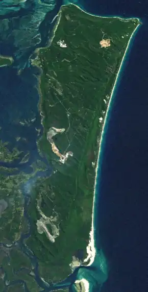 At 275.2 square kilometres (106.3 sq mi; 68,000 acres), it is the second largest sand island in the world.[8] On the island there are three small towns, a number of lakes and beaches along most of the seaward coastline with rocky outcrops at Point Lookout. An Aboriginal presence on the island has been long and ongoing, resulting in a successful native title determination. Tourism is a major and growing industry on the island.[9] The island has been the site for sand mining for more than sixty years. Tourism and currently mining are the island's main industries.