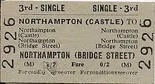Closures accelerated under British Railways with the withdrawal of services from Bridge Street station, which lost much if not all of its significance following the opening of the Loop,[27] on 4 May 1964[11][37] when the Northampton to Peterborough line was closed, leaving only Castle station serving the town.[29] As a result, Castle station was renamed Northampton on 18 April 1966.[11][39] In addition, the bay platforms 4 and 5 were removed and the area converted into an overflow car park.[40] The Great Northern and London and North Western Joint Line closed to all passenger traffic except for a workmen's service on 7 December 1953; the workmen's service between Market Harborough and East Norton ended on 20 May 1957.[41] The section between Welham Junction and Marefield North Junction closed in November 1963, followed by the Rugby and Stamford Railway on 6 June 1966.[41] The line to Market Harborough closed on 15 August 1981.[42]
