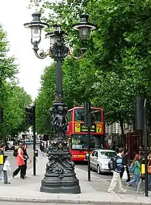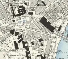 In June 1874, the whole of Northumberland House was purchased by the Metropolitan Board of Works and demolished to form Northumberland Avenue, which would accommodate hotels.[5][6] Contemporary planning permissions forbade hotels to be taller than the width of the road they were on; consequently Northumberland Avenue was built with a wide carriageway.[6] Part of the parallel Northumberland Street was demolished in order to make way for the avenue's eastern end.[4] The street was open by 1876.[7] The hotels were popular for American visitors as they were near to the West End, government buildings on Whitehall and all the mainline stations.[8]