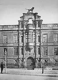 In 1608–09, Henry Howard, 1st Earl of Northampton built a house on the eastern side of the former Chapel and Hospital of St. Mary Rounceval, at Charing Cross, including gardens running to the River Thames and adjoining Scotland Yard to the west.[5] The estate became the property of Algernon Percy, 10th Earl of Northumberland when he married Howard's great-great niece, Lady Elizabeth, in 1642, whereupon it was known as Northumberland House. In turn, the street was named Northumberland Street.[5] The house was damaged in the Wilkes' election riots of 1768, but was saved after its owner, Hugh Percy, 1st Duke of Northumberland opened the nearby Ship Ale House, driving off rioters.[5]