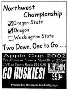 The Washington Huskies were successful in claiming the newly coined Northwest Championship in 2002.[10] Since then, Oregon[19] and Oregon State[3] have both also won the title and been called Northwest Champions by local media. Washington State has yet to complete the sweep in the years since the title was named, but several times has been on the hunt going into the end-of-season Apple Cup.[20]