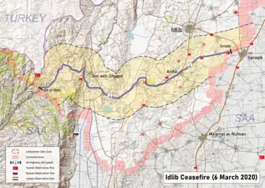 On 5 March 2020, a meeting took place between Turkish President Recep Tayyip Erdoğan and Russian President Vladimir Putin in which they agreed on a ceasefire beginning on 6 March that established a six-kilometer secure corridor along the M4 Highway. The ceasefire also called for joint Turkish–Russian patrols along the highway beginning on 15 March.[82]