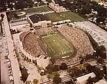 Following a winless 1921 season, Northwestern set up a committee to investigate the problem with its football team.[14] The committee recommended for the school to promote athletics, and for alumni to actively recruit high school football players to attend NU and join the team.[14] Equally important, the committee took the steps to hiring a full-time head coach for football, instead of a coach who also served as a NU faculty member or employee.[14] Glenn Thistlethwaite became the head coach for the 1922 season and helped change the culture of the program, as the Wildcats' depth and quality improved. Another key factor to NU's gridiron improvement was the leadership of NU President Walter Dill Scott[15] Scott, who was a guard on NU's football team as an undergrad during the 1890s, was a strong supporter of athletics. Of importance, Scott helped raise money for a new football facility, Dyche Stadium.[16] The 1924 team, led by center Tim Lowry and triple threat halfback Ralph Baker, was very competitive and finished with a 4–4 record. In fact, the team's performance against Chicago earned NU the nickname "Wildcats" after Chicago Sun-Times writer Wallace Abbey wrote that Chicago was stopped by a "wall of Purple Wildcats."[17] In 1925, Northwestern pulled off a huge upset against Michigan, winning 3–2 at Soldier Field. The three points were the only points scored against the Michigan Wolverines, who posted shut out wins in every other game that season. The following season, the Wildcats celebrated their inaugural season at Dyche Stadium by sharing the 1926 Western Conference Title with Michigan. Richard E. "Dick" Hanley was the head coach for the Wildcats for eight years, starting in 1927. Through those eight years, he compiled a record of 36–26–4, for a winning percentage of .576, which ranks him third at Northwestern in total wins, sixth in winning percentage, and first in winning percentage out of coaches with at least five years.[18] The Wildcats won a share of the Western Conference title in both 1930 and 1931, tying with Michigan and Michigan/Purdue, respectively. In both seasons, NU finished fourth in the final Dickinson rankings.