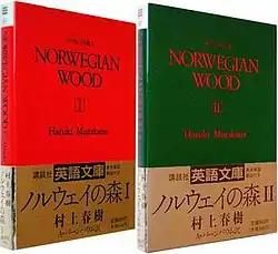 Norwegian Wood has been translated into English twice.[1] The first translation was by Alfred Birnbaum, who translated several of Murakami's earlier novels, and was published, in Japan only, in 1989 by Kodansha as part of the Kodansha English Library series.[10] Like other books in this pocket-sized series, the English text was intended for Japanese students of English, and the book featured an appendix listing the Japanese text for key English phrases encountered in the novel. This edition kept the two-volume division of the original Japanese version and its color scheme, the first volume having a red cover, the second green (the first UK edition in 2000 also kept this division and appearance). This earlier translation has been discontinued in Japan.