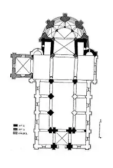The abbey church, now dedicated to Saint Denis, was built according to a roughly symmetrical cruciform plan that has generally remained unchanged, except for the addition of the Early Gothic chapel. The church stands on a northeast–southwest orientation, irregular for a church. Its layout consists of a one-bay narthex at the base, a three-bay nave with two aisles in the middle, a single-bay transept with attached bays flanking the choir that were the bases to a pair of rectangular towers, one bay long and connected to a semicircular apse of the same length, and an ambulatory four bays long. There is an imbalance in the nave's aisles, though they are of the same length.[12][13][14]