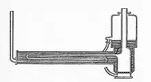 Like George Stephenson, Ericsson understood that a large area was needed to extract heat from the hot gases. This he did in a long horizontal tube filled with water which ran under the full length of the engine. It can be seen in the illustration on top of this page, sticking out to the right, with the vertical chimney attached to it. Within the horizontal section was a tube carrying the hot gases, this formed an ‘S’ shape so the gases made three passes through the water. This ‘S’ shaped tube was also tapered causing the gases to speed up as they cooled down. In practice this tube is almost impossible to clean.