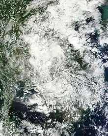 Later that day, the JMA had analysed that the tropical depression had reached its maximum intensity with a minimum barometric pressure of 1004 hPa (29.65 inHg).[5] Just before November 5, the JTWC issued a Tropical Cyclone Formation Alert (TCFA), while located atop of warm waters with temperatures of approximately 29 °C (84.2 °F).[6] However, the next day, the JTWC cancelled their alert, as the system was weakening and nearing land, while increasing wind shear did not favor development. The depression made landfall over in Bình Thuận and Bà Rịa-Vũng Tàu in Southern Vietnam and continued moving westwards.[7] The JMA stopped monitoring on the system over land early on November 6.[8]