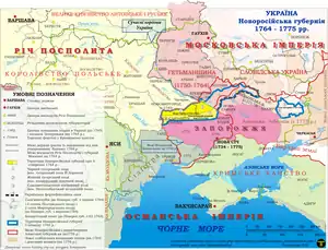 Novorossiya Governorate (Russian: Новороссийская губерния, romanized: Novorossiyskaya guberniya, lit. 'New Russia Governorate'; Ukrainian: Новоросійська губернія), was a governorate of the Russian Empire in the previously Ottoman and Cossack territories, that existed from 1764 until the 1783 administrative reform. It was created and governed according to the "Plan for the Colonization of New Russia Governorate" issued by the Russian Senate.[1] It became the first region in Russia where Catherine the Great allowed foreign Jews to settle.[1]