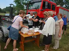 The tradition of pilgrimages to the Shrine of Virgin Mary of Częstochowa began with the Reverend Józef Leonowicz, who first consecrated the shrine and then organized a church fair and pilgrimage. Although no more than 7 families lived in Nowa Wieś Reszelska, the news about the pilgrimage spread across the whole area. With each coming year, more and more people from neighbouring villages participated in the mass and the fair. At one time over 100 people participated in the event. Pilgrimages to nearby sites (in the Warmia dialect called łosiera) usually take place near large religious centres like the marine sanctuary in Święta Lipka.[10] Pilgrimages to such a small shrine like the one in Nowa Wieś Reszelska are very rare.[11]