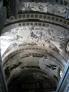 The other most notable sign of disrepair is the state of the paintings on the ceilings. Almost all the frescos here are gone.[4] The cupola was sealed against rain in 1995, and an attempt to revitalize the paintings of the church was done in 2001, spending a million pesos, but the artwork here still remains in very poor condition.[6] The primary problem is the passage of time and the lack of maintenance.[4] What is left of the 200-year-old frescos is flaking off. Dust, paint flecks and pieces of plaster are swept from the church’s floor every morning.[6] The Archdiocese claims that it does not have to money to repair the damage. The federal government has interest in preserving the structure due to its historic value,[2] but since it is still an active religious institution, the Loreto Church cannot received federal funds from agencies such as INAH.[6]