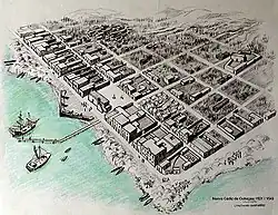 As early as 1502, rancherías were established on Cubagua, occupied for 3–4 months each year during trading.[2] The island was of particular interest because of its rich pearl oyster beds.[3] Eventually, the settlement became permanent and, by 1520, after the great Indian uprising, its resident population surpassed 300. On September 12, 1528 by a royal decree issued by Charles V, Nueva Cádiz was incorporated and became a city named Nueva Cádiz.[4][5] It became the first Spanish town in South America.[5][6]