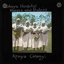 In 1908, nursing in Kenya began when missionaries who visited Kenya provided training.[1] The first nurses were primarily male and were known as "dressers."[1] Their primary responsibilities included dressing wounds, administering injections, and managing hospitals.[1]