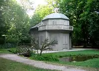 The Badenburg is located at the southeastern end of the Great Lake. The structure dominates parts of the lake, as it smoothly sits into a visual axis where it can also be seen from the north. The castle was built by Joseph Effner from 1718 to 1722. For centuries it was the first large building in Europe that was used solely for the purpose of enjoying a comfortable bath.[34] As part of the restoration from 1983 to 1984, the wooden shingle roof and the ocher-yellow coloring of the building were restored.