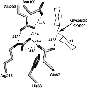 Since bacterial cell walls do not contain chitin, OBPgp279 hydrolyzes β-1,4-linked GlcNAc in peptidoglycan.[2] The hydrolysis of β-1,4-linked GlcNAc is catalyzed by two glutamate residues in the active side, one acting as a general acid, and another acting as a general base.[6]