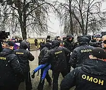 OMON, along with the internal troops, and the anti-terrorist "Almaz" elite special force participated in the suppression of the 2020 Belarusian protests in Minsk. They utilized water cannons near the Riga Market, and rubber bullets at large gatherings. It was also reported that OMON squads commandeered ambulances and vans to deceive the protesters into allowing them through the created barricades.[12][13] During the protests, the vans of the team of Siarhei Tsikhanouski was by vans filled with members of OMON.[14]