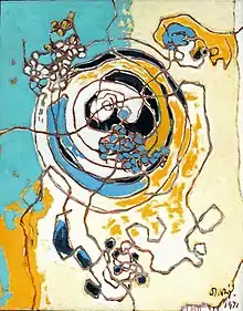At the base of ORAZI's artistic exploration there were Nature, its elements, and its phenomena (flowers, sands, stones, rocks, volcanic lava, streams, sea shores, sea beds, eruptions, storms, petrified meteorites).[35] Regarding this aspect, it is pertinent to mention a passage written for a French fine art journal by the art critic Jean-Jacques Lévèque on ORAZI's exhibition of 1966 at the Parisian art gallery ‘Galerie du Passeur’: “With ORAZI, who exhibits at the Gallery of the Passeur[...] it is a spectacle. A natural spectacle, of the life of soil, of the harsh and poignant thrusts that structure the natural world. Knotty, convulsive shapes suddenly take hold of space and in their irresistible momentum blossom beyond the limits imposed by the paintings' frame.”.[36]
