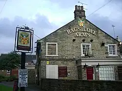 Although not on the original Oakes Park estate, the Bagshawe Arms stands adjacent to it on the north side of Norton Avenue. It was originally a farmhouse belonging to the Bagshawes built with stone from the local Mawfa Lane quarries, it was enlarged and renovated in 1829 and has served as an inn since at least 1844. There is a stone embedded in the south end of the gable with the initials "F.W.B." (Francis Westby Bagshawe) along with a date of 1859.[8]