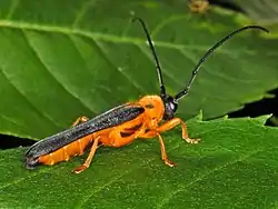 Oberea pupillata measures between 13 and 18 mm (0.51 and 0.71 in).[4] These beetles have a long and slender body. Head, thorax and abdomen have all about same width, and elytra are not tapered. Head and antennae are black and antennae are shorter than body. Pronotum is orange with two elongated black spots on the sides. The elytra are mostly blackish, yellowish at the base and rather hairy. The body is orange, with black markings on the sides and below the abdomen. The last abdominal segment shows a black mark. The legs are orange.