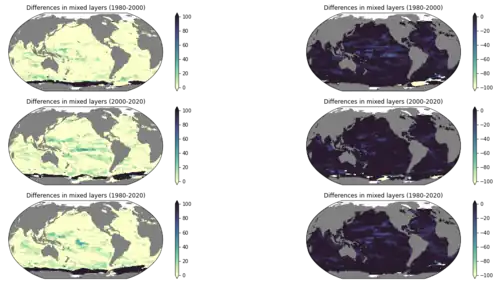 ![]() Annual means and change in annual means of the mixed layer depth of 1980, 2000 and 2020. This plot was generated using the GODAS Data.[4] |