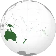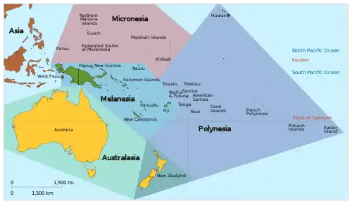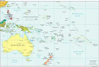 The United Nations (UN) has used its own geopolitical definition of Oceania since its foundation in 1947, which utilizes four of the five subregions from the 19th century; Australasia, Melanesia, Micronesia, and Polynesia. This definition consists of discrete political entities, and so excludes the Bonin Islands, Hawaii, Clipperton Island and the Juan Fernández Islands, along with Easter Island — which was annexed by Chile in 1888.[66] It is used in statistical reports, by the International Olympic Committee, and by many atlases.[67] The UN categorizes Oceania, and by extension the Pacific area, as one of the major continental divisions of the world, along with Africa, Asia, Europe and the Americas. Their definition includes American Samoa, Australia and their external territories, the Cook Islands, Federated States of Micronesia, French Polynesia, Fiji, Guam, Kiribati, the Marshall Islands, Nauru, New Caledonia, New Zealand, Niue, the Northern Mariana Islands, Palau, Papua New Guinea, Pitcairn Islands, Samoa, the Solomon Islands, Tokelau, Tonga, Tuvalu, Vanuatu, Wallis and Futuna, and the United States Minor Outlying Islands (Baker Island, Howland Island, Jarvis Island, Midway Atoll, Palmyra Atoll, and Wake Island).[66] The original UN definition of Oceania from 1947 included these same countries and semi-independent territories, which were mostly still colonies at that point.[68] Hawaii had not yet become a U.S. state in 1947, and as such was part of the original UN definition of Oceania. The island states of Indonesia, Japan, the Philippines, Singapore and Taiwan, all located within the bounds of the Pacific or associated marginal seas, are excluded from the UN definition. The states of Hong Kong and Malaysia, located in both mainland Asia and marginal seas of the Pacific, are also excluded, as is the nation of Brunei, which shares the island of Borneo with Indonesia and Malaysia. Further excluded are East Timor and Indonesian New Guinea/Western New Guinea, areas which are biogeographically or geologically associated with the Australian landmass.[69][70] The CIA World Factbook also categorizes Oceania as one of the major continental divisions of the world, but the name "Australia and Oceania" is used. Their definition does not include all of Australia's external territories, but is otherwise the same as the UN's definition, and is also used for statistical purposes.[71] In a 2008 article for the India Quarterly journal titled Oceania and Security: A Perspective from New Zealand, author Peter Cozens stated, "the region of Oceania is characterised by vast distances across the sea between continental land masses [...] It is difficult to be precise about the term Oceania and its exact delimitation", adding that "the principal regional political grouping is contained within the Pacific Island Forum (PIF) - the 16 states making up the Forum are: Australia, Cook Islands, Federated States of Micronesia, Fiji, Kiribati, Marshall Islands, Nauru, New Zealand, Niue, Palau, Papua New Guinea, Samoa, Solomon Islands, Tonga, Tuvalu and Vanuatu - in general terms this is the area referred to as Oceania by the United Nations and similar agencies."[72] The Pacific Islands Forum expanded during the early 2010s, and areas that were already included in the UN definition of Oceania, such as French Polynesia, gained membership.[73]