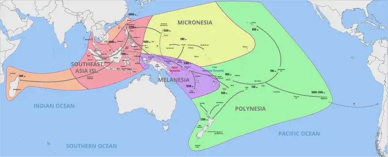 The Polynesian people are considered to be by linguistic, archaeological and human genetic ancestry a subset of the sea-migrating Austronesian people and tracing Polynesian languages places their prehistoric origins in the Malay Archipelago, and ultimately, in Taiwan. Between c. 3000 and 1000 BCE, speakers of Austronesian languages began spreading from Taiwan into Island South-East Asia,[199][200][201] as tribes whose natives were thought to have arrived through South China c. 8,000 years ago to the edges of western Micronesia and on into Melanesia.