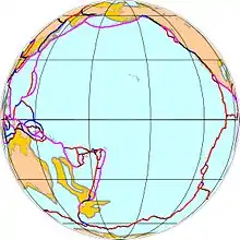 The Pacific Plate, which makes up most of Oceania, is an oceanic tectonic plate that lies beneath the Pacific Ocean. At 103 million square kilometres (40,000,000 sq mi), it is the largest tectonic plate. The plate contains an interior hot spot forming the Hawaiian Islands.[237] It is almost entirely oceanic crust.[238] The oldest member disappearing by way of the plate tectonics cycle is early-Cretaceous (145 to 137 million years ago).[239]