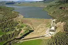The original 1920 Ochoco Dam was privately built, 126 feet (38 m) high and 1,000 feet (300 m) long. Chronic leaking through its middle section posed a constant threat to the city of Prineville, close downstream, so the dam was replaced by the United States Bureau of Reclamation in 1949.[2] The 1949 reconstruction brought the earthen dam to 152 feet (46 m) high. In the mid 1990s the reservoir was drained twice for additional safety retrofitting. Although the Bureau of Reclamation has been involved in much of the work here, title to the dam is held by the Ochoco Irrigation District.[3]