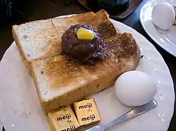 Ogura toast (小倉トースト, ogura tōsuto) is a dish of thickly-sliced, toasted bread topped with ogura jam (a common sweet spread or filling in Japan, made from red beans), served in cafés in Nagoya.[1]
