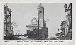 Harrisburg suffered flooding from the Ohio River in 1883–1884 and again in 1913. Much of the city, except "Crusoes' Island", a downtown orbit that encircled the town square, was underwater. High water had reached 30 miles (48 km) from the river, and the city was flooded in its position among tributary lowlands of the Saline River.[15] Floodwaters reached nearly 30 miles (50 km) inland and Harrisburg was nearly destroyed. 4,000 within Harrisburg were left homeless and 80% of the city was inundated.[16] Many flooded mines were deemed condemned which left the local economy crippled. In 1938, the state of Illinois had completed one of the largest operations of its kind ever attempted in the United States, the removal of more than two and a half billion gallons of flood water from Sahara mine No. 3 near downtown Harrisburg.[17] By the time the flood waters had receded, 4000 were left homeless.[16] Between Gallatin County and Harrisburg, about 25 miles (40 km) of Illinois Route 13 was covered by 8.0 to 14.0 feet (2.4 to 4.3 m) of water; motorboats navigated the entire distance to rescue marooned families.[18] National guard boats were the means of transportation in the city, and several thousand people were transported daily from temporary island to island.[19] According to the Sanborn Map Company, Harrisburg in October 1925 had a population of 15,000, and in a revised version by January 1937 the population had fallen to 13,000. Afterwards, the Army Corps of Engineers erected a levee north and east of the city to protect it from future floods. The levee has become the official northern and eastern border of the town.