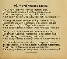 Oh, the Red Viburnum in the Meadow (Ukrainian: Ой у лузі червона калина - Oi u luzi chervona kalyna) is a Ukrainian patriotic march first published in 1875 by Volodymyr Antonovych and Mykhailo Drahomanov.[1][2][3] It was written in a modern treatment by the composer Stepan Charnetsky in 1914, in honor and memory of the Sich Riflemen of the First World War. The song has many variations.