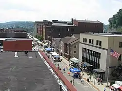 Oil City began platting extensive areas of land between 1869 and 1872. This included the upper and lower south side, Palace Hill, upper Cottage Hill and Clark's Summit.[17] A 1,600-foot (490 m) long funicular ascended the 460-foot (140 m) high hill. Built in 1872, the Panic of 1873 devastated home sales on Clark's Summit. The funicular company went bankrupt, and the track was removed in 1879.[20] In 1869, Thomas Martindale opened the first health food store in Oil City,[21] thought to be the first natural foods store in the United States.[22]