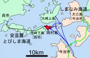 The island can be accessed by ferry from Imabari or from Ōmishima Island, Ehime. It can also be accessed by road from the city of Kure, Hiroshima Prefecture through the Akinada Islands Connecting Bridges.[1] The last of these bridges, the Okamura Great Bridge, is a 228 metre long arch bridge which connects Okamura Island with Nakano Island.[2]
