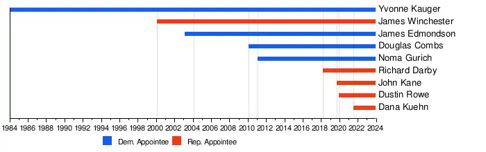 | Joseph M. Watt | 1992 | 2017 | David Walters | Mary Fallin | 15 years | Richard Darby |